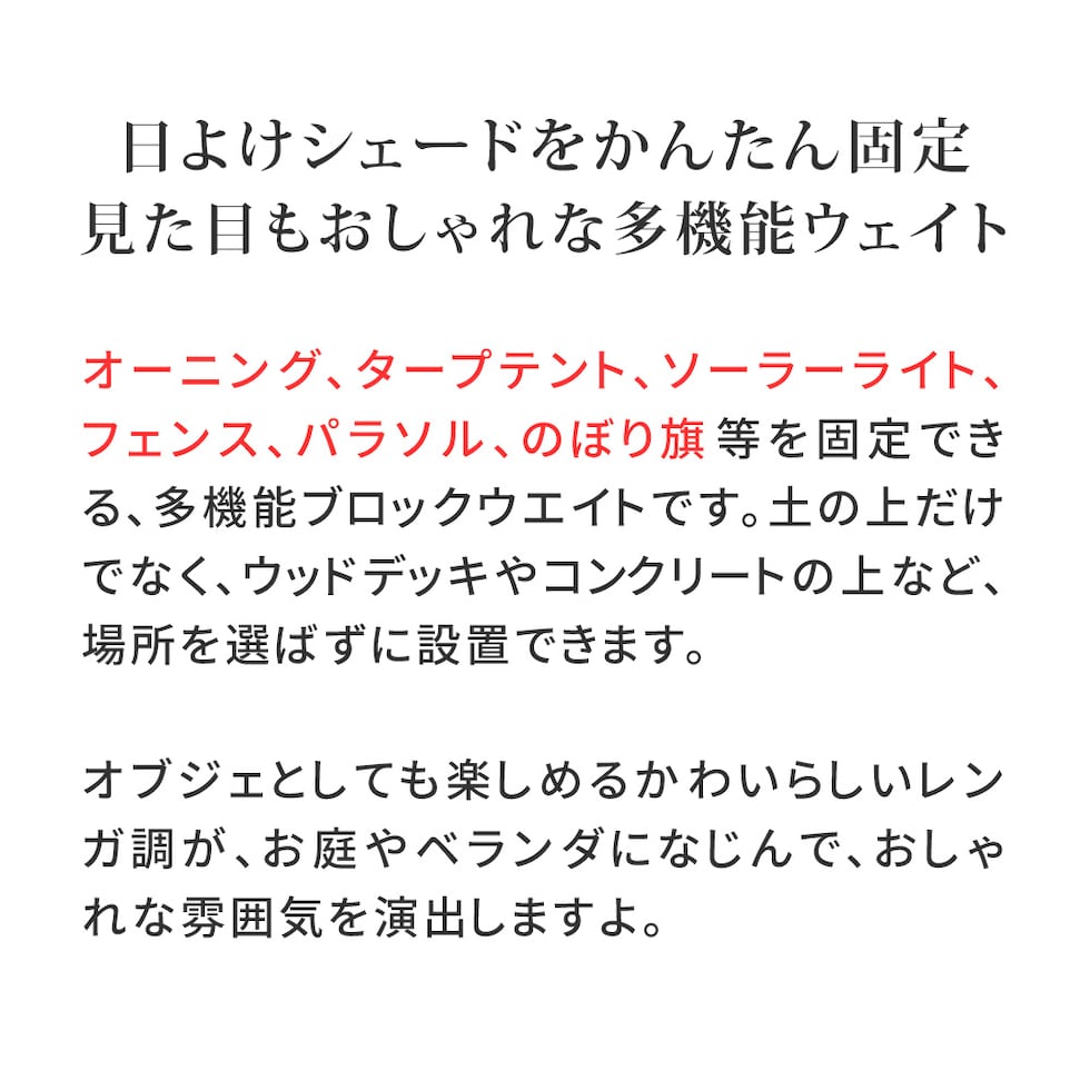 オーニング、タープテント、ソーラーライト、フェンス、パラソル、のぼり旗等を固定できる、多機能ブロックウエイトです。