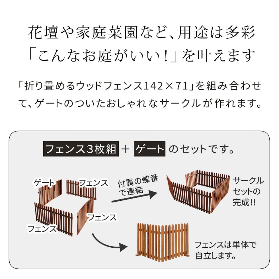 「折り畳めるウッドフェンス142×71」を組み合わせて、ゲートのついたおしゃれなサークルが作れます。