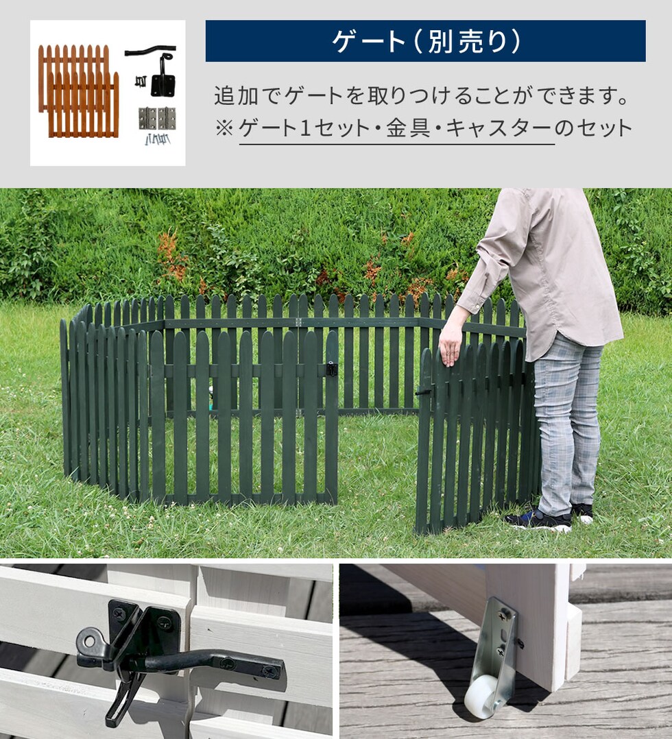 ゲートがつけられるので、お庭や花壇の入り口に設置したり、ペットサークルを作ったり等、アイデア次第で活躍の幅が広がりますよ。