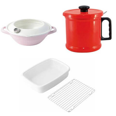 天ぷら鍋 オイルポット 網付きホーロー容器 調理器具 3点セット 富士ホーロー【てんぷら鍋 揚げ鍋 揚げ物 温度計付き IH対応 天ぷらバット 琺瑯】ピンク-天ぷら鍋 レッド-オイルポット