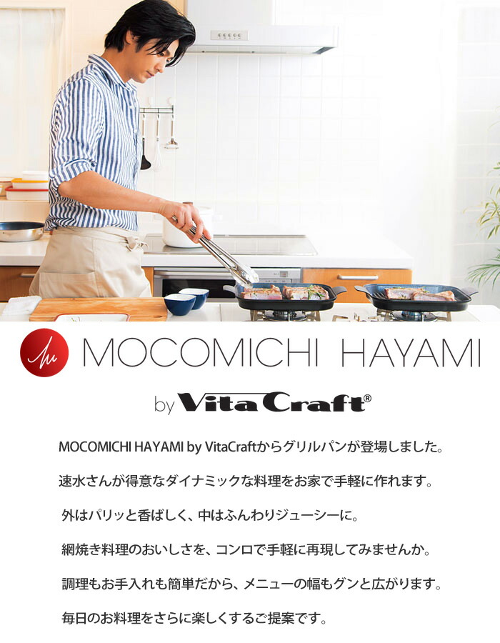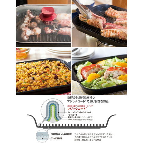 | 商品説明 | 速水もこみちプロデュースのキッチンブランド「MOCOMICHI HAYAMI」からグリルパンが登場! 抜群の耐摩耗性を持つ、”マジックコート”で焦げ付きを防止。 外はパリッと香ばしく、中はふわっとジューシーに。 網焼き(グリル)料理の美味しさを自宅で気軽に味わえる、グリルパンです。 肉や魚はもちろん、ピラフやホットサンド、ケーキまで幅広いメニューを調理できます。 ガラス蓋で中が見やすく、グリルパン初心者も安心です。 |