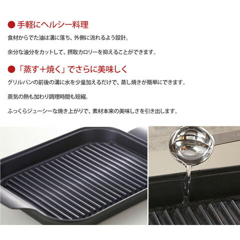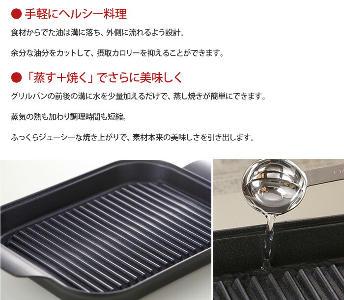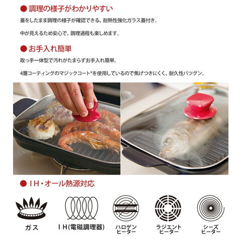 | 商品特長 | ●手軽にヘルシー料理 食材からでた油は溝に落ち、外側に流れるよう設計。余分な油分をカットして、摂取カロリーを抑えることができます。 ●「蒸す+焼く」でさらに美味しく グリルパンの前後の溝に水を少量加えるだけで、蒸し焼きが簡単にできます。蒸気の熱も加わり調理時間も短縮。 ふっくらジューシーな焼き上がりで、素材本来の美味しさを引き出します。 ●調理の様子がわかりやすい 蓋をしたまま調理の様子が確認できる、耐熱性強化ガラス蓋付き。中が見えるため安心で、調理過程も楽しめます。 ●お手入れ簡単 取っ手一体型で汚れがたまらずお手入れ簡単。 4層コーティングのマジックコートを使用しているので焦げつきにくく、耐久性バツグン。 |