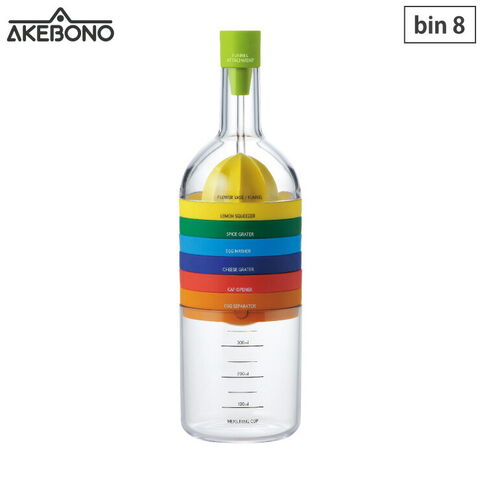 ロート、レモン絞り、薬味おろし、玉子つぶし、チーズおろし、キャップオープナー、黄身取り、計量カップをまとめてコンパクトに収納できます。