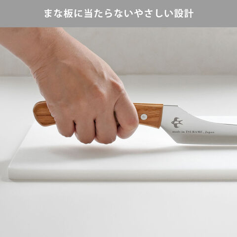 刃は特殊鋼材を使用し、見た目の美しさと同時に摩擦を減らし切れ味をアップさせた鏡面仕上げです。天然木のケヤキを使用した手になじむ背通しハンドルで、まな板に指が当らない親切設計です。