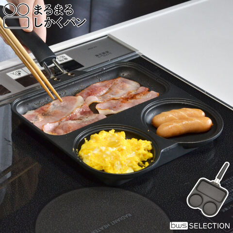 3つの仕切りで3種類の料理を一度に作れるフライパン。一度に作れて時短になり、忙しい朝の朝食つくりに最適です。