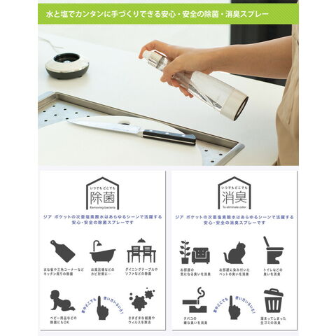 水と塩でカンタンに手づくりできる安心・安全の除菌・消臭スプレー『ZIA pocket(ジア ポケット)』は、ご家庭にある水と塩で簡単につくることができる、これまでになかった除菌・消臭スプレーです。