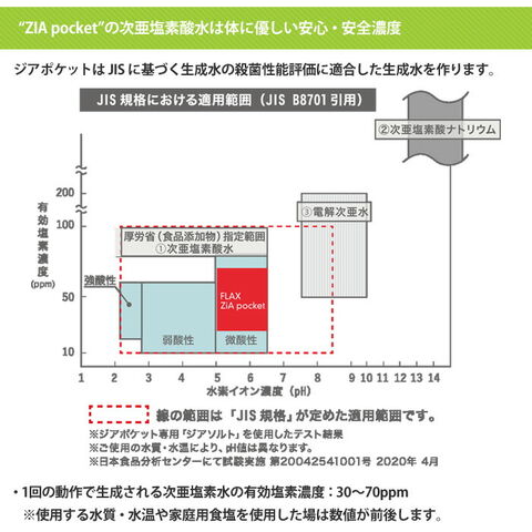 ジアポケットは「JIS 適合商品」ですジアポケットで生成される次亜塩素酸水は「JIS B 8701」に基づくテストの結果、「殺菌性能あり」との判定を受け、JIS 適合商品と認定されました。