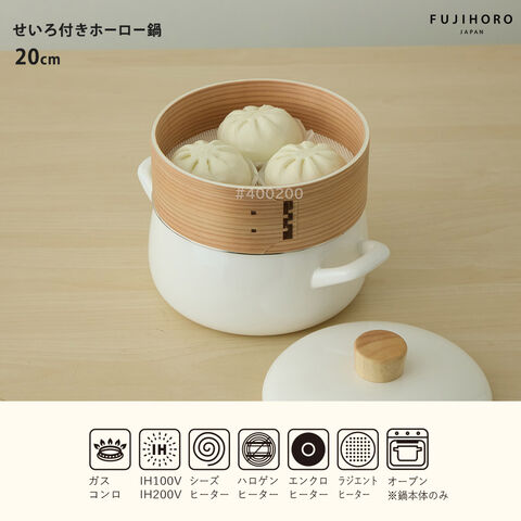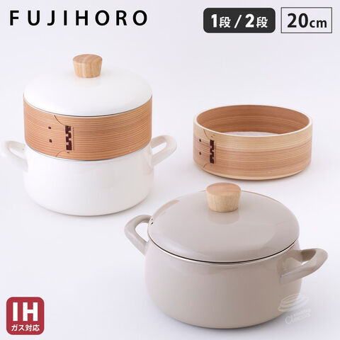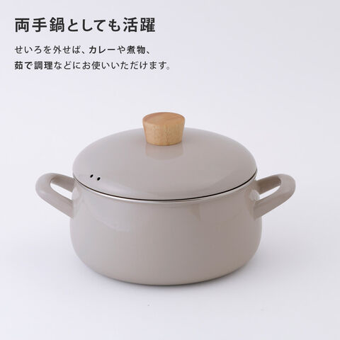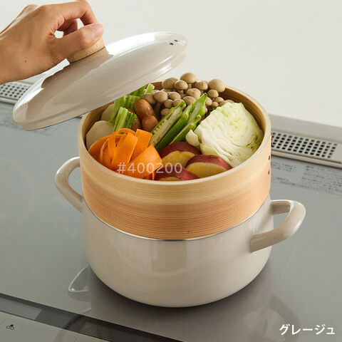 せいろ付きホーロー鍋 20cm 富士ホーロー ガス火 IH対応 1段 2段 シリコンメッシュシート SER-20W【琺瑯 両手鍋 竹せいろ 蒸篭 中華セイロ 蒸し セット 蒸し鍋 スチーマー】 グレージュ2段
