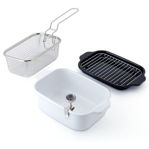 揚げ物調理に便利なバット&揚げ網、温度計が付属しています。温度計は着脱可能なクリップタイプで、丸洗い可能な防水型です。付属品は本体と重ねてコンパクトに収納できます。