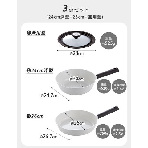 | セット内容 | ●深型フライパン 24cm 約W41.2 × D24.7 × H8cm、内径:約24cm、深さ:約7cm 約620g / 2.6L ●フライパン 26cm 約W43.2 × D26.7 × H7.5cm、内径:約26cm、深さ:約5cm 約759g / 2.5L ●フライパン兼用蓋 約W28 × D28 × H5.7cm 約525g |