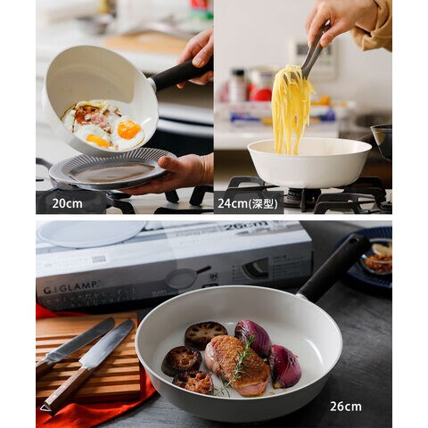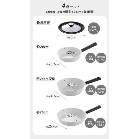 | セット内容 | ●フライパン 20cm 約W37.2 × D20.7 × H8cm、内径:約20cm、深さ:約4.6cm 約510g / 1.4L ●深型フライパン 24cm 約W41.2 × D24.7 × H8cm、内径:約24cm、深さ:約7cm 約620g / 2.6L ●フライパン 26cm 約W43.2 × D26.7 × H7.5cm、内径:約26cm、深さ:約5cm 約759g / 2.5L ●フライパン兼用蓋 約W28 × D28 × H5.7cm 約525g |
