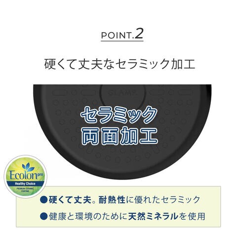 天然ミネラルを使用したセラミックコーティングのフライパン。独自開発のコーティング技術「エコロンプロ」を駆使し、セラミックコーティングの弱点であるノンスティック効果を大幅にUP。