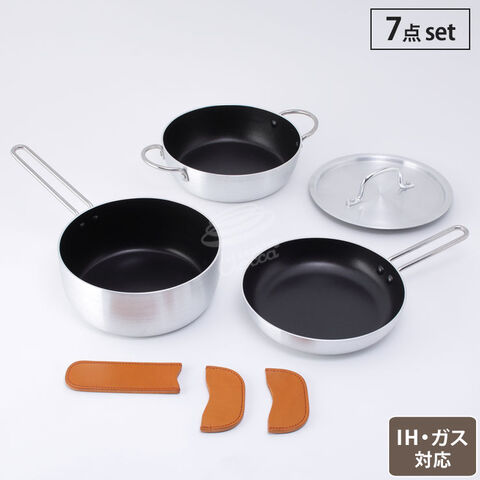 調理器具と兼用蓋、ハンドルや蓋つまみに装着できるレザーミトンの7点セットです。