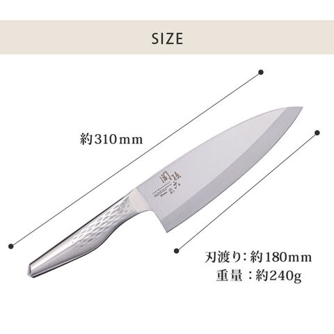 継ぎ目のない、一体構造のオールステンレスタイプ。出刃180mmは、鯛など大きな魚をおろすのに適したサイズです。