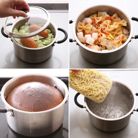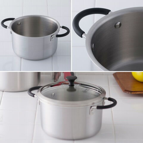 | 材質 | 【鍋】 本体:18-8 ステンレス鋼、アルミニウム合金、ステンレス鋼 (クロム 18%)(底の厚さ 2.0mm) ハンドル:ステンレススチール (一部シリコーンゴム被覆:耐熱 230℃) 【蓋】 全面物理強化ガラス、フレーム部:ステンレススチール、つまみ:フェノール樹脂 (耐熱 230℃) |