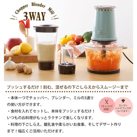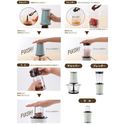 | 商品説明 | プッシュするだけ!刻む、混ぜるの下ごしらえからスムージーまで、レパートリーがぐんと広がります。 ●本体一つでチョッパー、ブレンダー、ミルの3通りの使い方ができます。 ●食材を入れてセットし、本体をプッシュするだけ!いつものお料理がもっとラクチンで楽しくなります。 ●料理の下ごしらえ、離乳食や柔らかいお食事、そしてデザートまで。幅広くご活用いただけます。 |