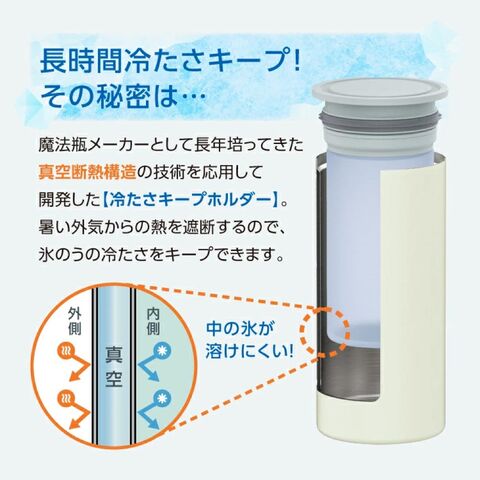 真空断熱構造の冷たさキープホルダーに入れて氷のうを持ち運ぶことで、厚い外気からの熱を遮断し冷たさが長続きします。