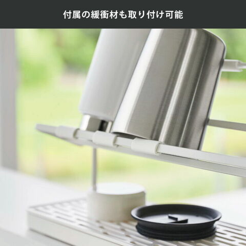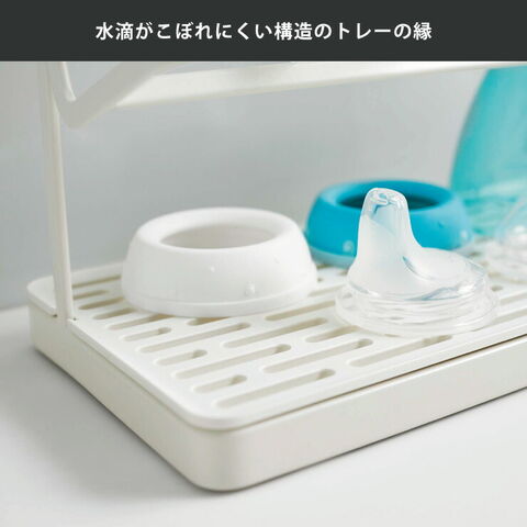 哺乳瓶やマグボトルを干せる便利な水切りラック本体と触れる部分に付属の緩衝材を取り付けることもできますトレーの縁は水滴などがこぼれにくい構造です容器は分解できるので洗って清潔に保てますシンクやキッチンカウンターなど好みの場所に