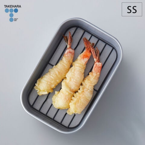 お手入れが簡単なフッ素樹脂加工がされた天ぷらバット。並べて使用しても邪魔になりにくいぷちサイズ。