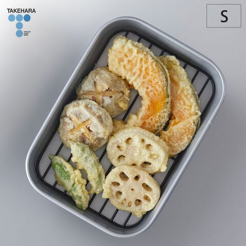 お手入れが簡単なフッ素樹脂加工がされた天ぷらバット。並べて使用しても邪魔になりにくいぷちサイズ。