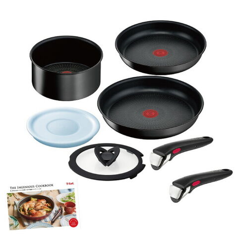 | セット内容 | 1.フライパン 22cm 直径23.8×高さ5cm / 615g / 満水容量1.7L 2.フライパン 26cm 直径27.8×高さ5cm / 893g / 満水容量2.3L 3.ソースパン 18cm 直径19.4×高さ9.5cm / 653g / 満水容量2.3L 4.バタフライガラスぶた 18cm 直径19.1×高さ2.3cm / 325g 5.シールリッド 18cm 直径20.4×高さ2.2cm / 75g 6.専用取っ手 2本 18.3×4.5×4.7cm / 190g 7.レシピブック (取っ手のとれるティファールを使いこなす 厳選メインディッシュ22) |