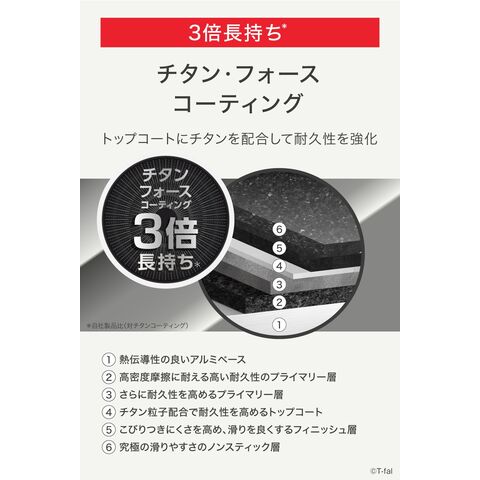 高い耐久性を実現した チタン・フォースコーティングで、使い始めのこびりつきにくさが長く続きます。