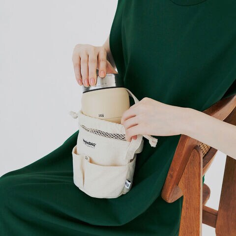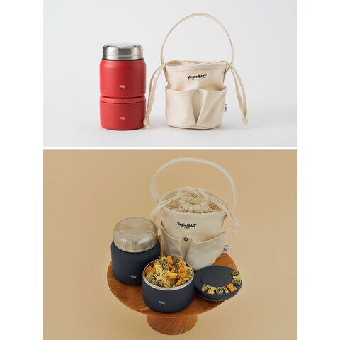 自立型で多数のポケットをあしらった実用的な形をそのままに、thermo mugのミニタンクとフードコンテナをスタッキングして運ぶのにとても最適なデザインになっております。