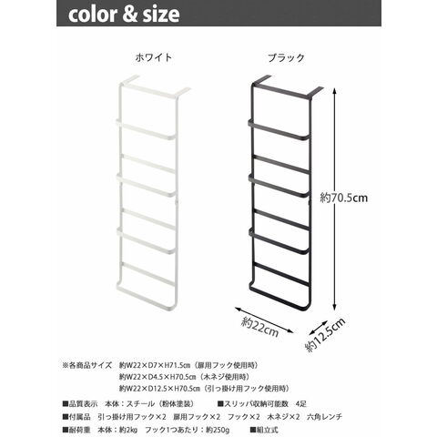 | サイズ | (約)W22×D12.5×H70.5cm(引っ掛け用フック使用時) (約)W22×D7×H71.5cm(扉用フック使用時) (約)W22×D4.5×H70.5cm(木ネジ使用時) |