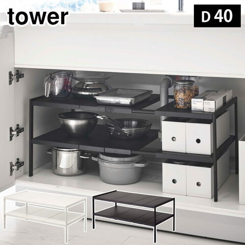 タワー 伸縮シンク下ラック 2段 D40 山崎実業 4950 4951【シンク下 収納 伸縮 ラック 伸縮棚 奥行40cm キッチン収納 yamazaki tower タワーシリーズ】 ホワイト