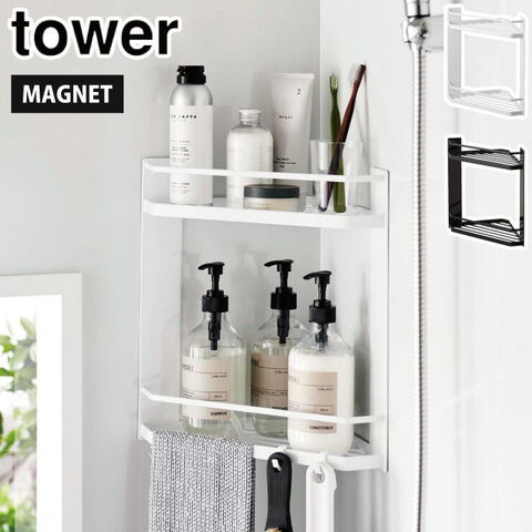 タワー マグネットバスルームコーナーラック 2段 山崎実業 6623 6624 yamazaki tower【バスラック コーナーラック マグネット収納 フック バスルーム お風呂 小物収納 浴室収納 タワーシリーズ】 ブラック
