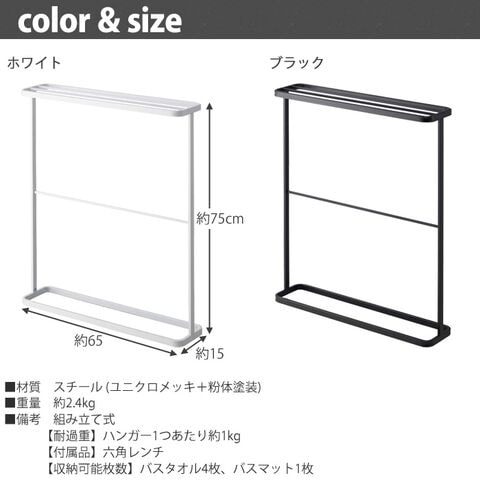 | 商品説明 | 様々な空間にマッチする省スペース設計のスリムなバスタオルハンガー。 上部にバスタオルを4枚、下部にはバスマットを1枚干せます。 壁面ぎりぎりに寄せることが出来るスリムな設計です。 |