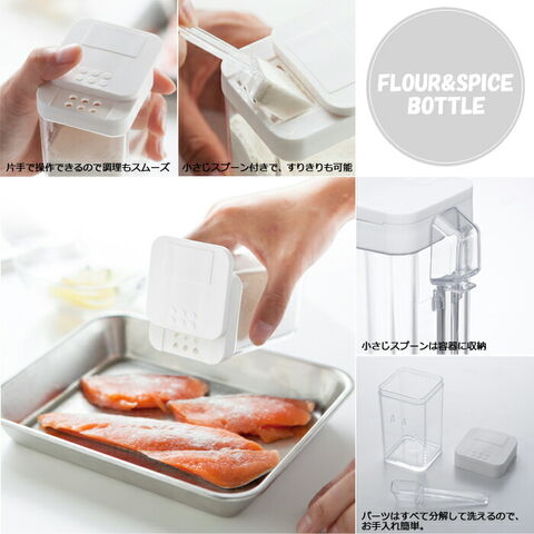 | 商品説明 | さらさらタイプの小麦粉やスパイスなどを簡単ふり掛け!詰め替え用のさらさらタイプの小麦粉や塩コショウ・スパイス等をふり掛けられます。 前後にフタをスライドさせ、分量を選んで出すことができます。 小さじスプーン(5ml)付きで、すり切り計量も可能です。小さじスプーンは容器に収納できます。 片手で操作できるので調理もスムーズ。パーツはすべて分解して洗えるので、お手入れ簡単。 使いたい量が片手で調節できる調味料保存容器です。四角い形状で引き出しやラックなどに無駄なくすっきり収納できます。 |