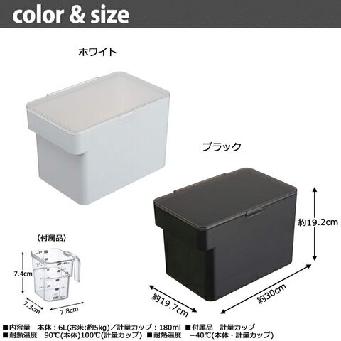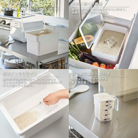 | 商品説明 | システムキッチンの引き出しに合うスタイリッシュな米びつ。パッキンでしっかり密閉され、お米が最後まできれいにすくえます。 蓋をパチッとロックしておけば、お米を湿気と酸化から防いでくれます。キッチンカウンターなど炊飯器の横に置いてもスタイリッシュで作業もスムーズ。 蓋は全面が開くからお米がすくいやすく、残量が分かりやすい透明蓋。 段差メモリで一目で分かる段々米計量カップが付属しています。すり切り一杯で1合、段差部分で半合です。普通米と無洗米が測れます。 底面のお米ごっそりラインで、底の形が付属の計量カップにピッタリとフィットするから、残りのお米をきれいにすくい取ってくれます。 |