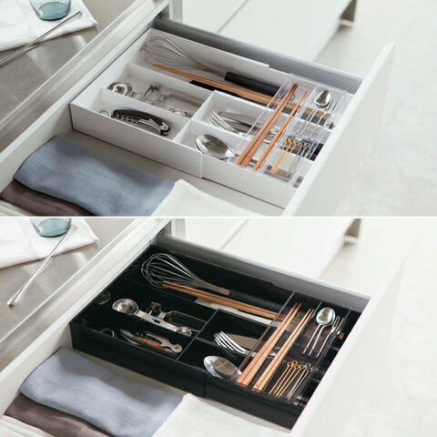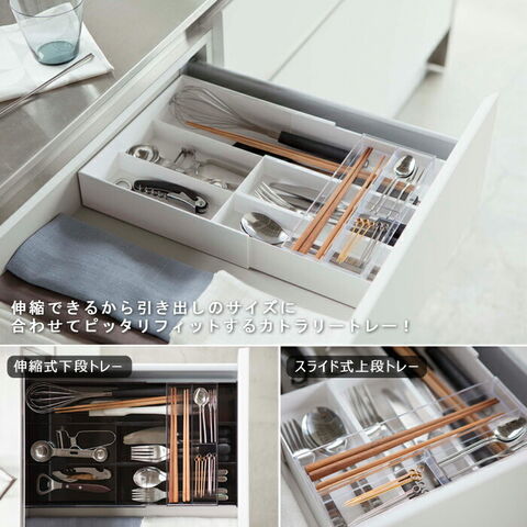 | 商品説明 | 引き出しのサイズに合わせてピッタリフィットする伸縮カトラリートレー!伸縮式の下段にはスプーン、フォークはもちろん、伸縮することで菜箸やフライ返し、泡立て器といった長さのあるキッチンツールも収納できます。 上段のスライド式トレーには箸や箸置き、ティースプーンやお弁当のピックなどの小物を整理して収納できます。 |