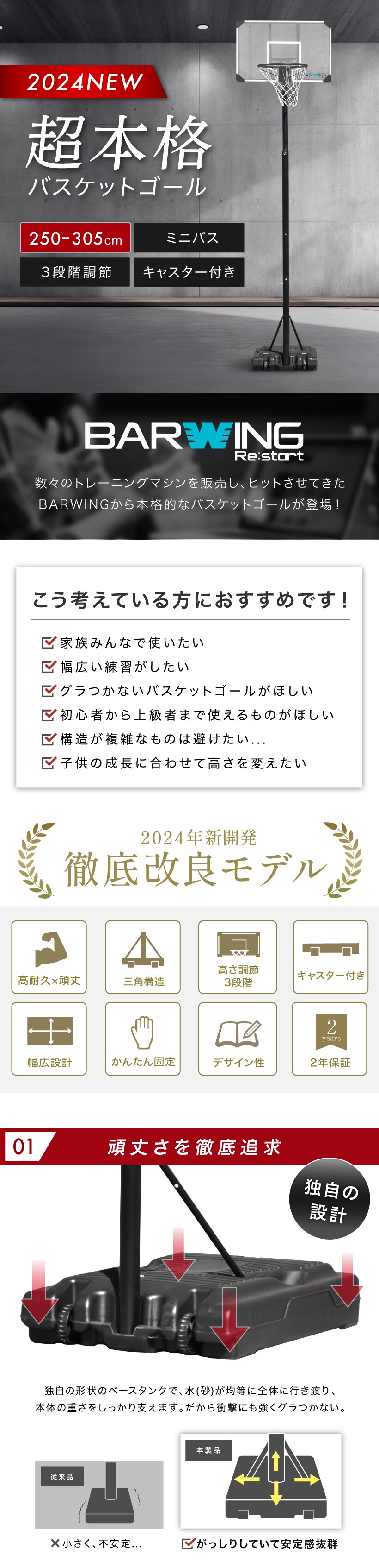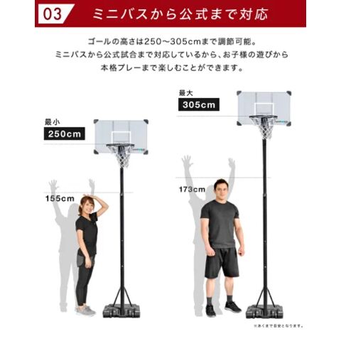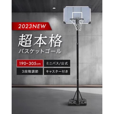 【2024年徹底改良モデル】 バスケットゴール 3段階調節 250cm~305cm ミニバスサイズ200cm 一般公式サイズ 305cm まで対応 キャスター付き 屋外 家庭用 移動式 練習用 公式サイズ リング 43cm バスケットボール ミニバスケット ゴールル バスケットボード