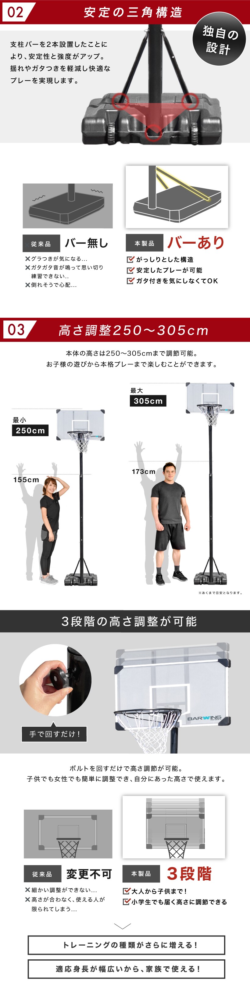 【2024年徹底改良モデル】 バスケットゴール 3段階調節 250cm~305cm ミニバスサイズ200cm 一般公式サイズ 305cm まで対応 キャスター付き 屋外 家庭用 移動式 練習用 公式サイズ リング 43cm バスケットボール ミニバスケット ゴールル バスケットボードのレビュー