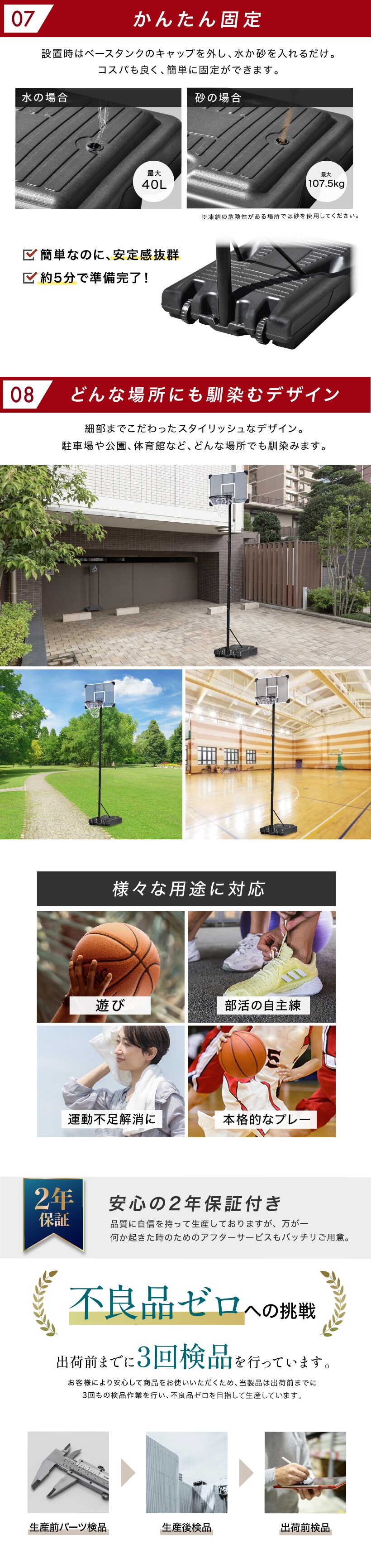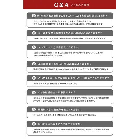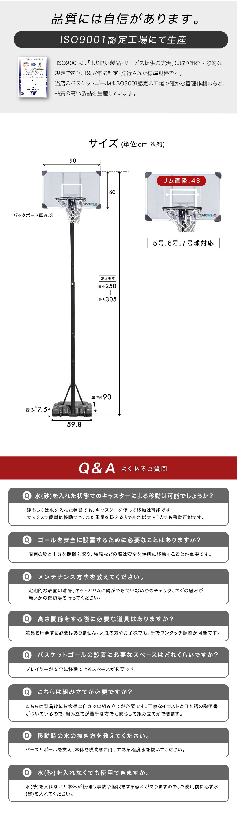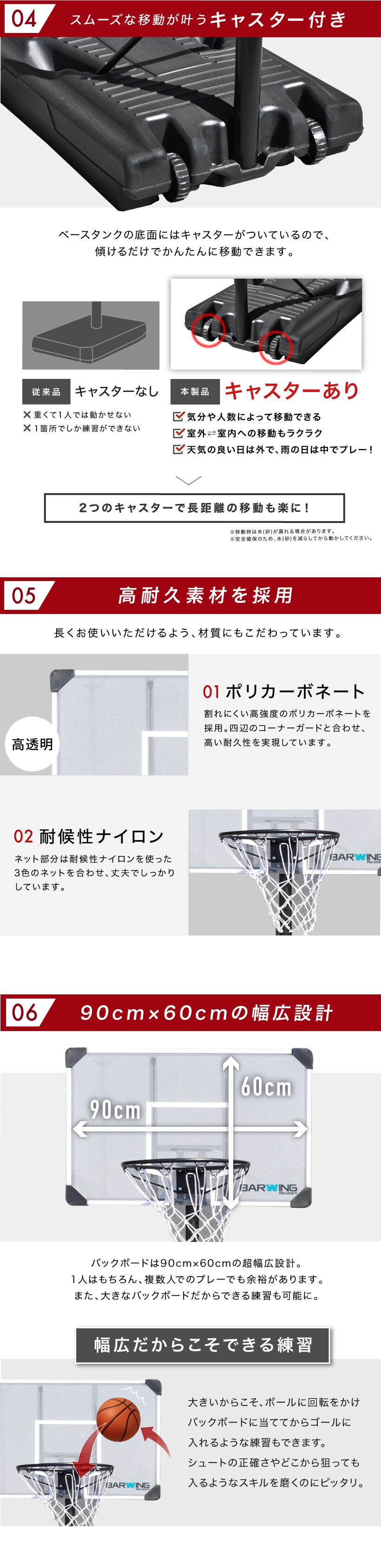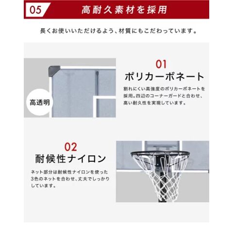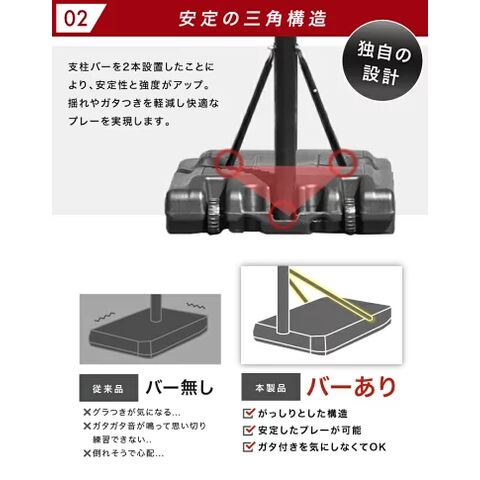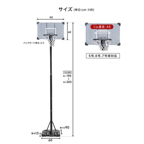 型番 BW-BSKG05 商品 サイズ 本体(約):W60×D90×H190-305(cm) バックボード サイズ W90×D2.5×H60(cm) 重量 約12.5kg カラー ブラック 材質 本体:スチール、 PC、 PE 組み立て時間 約1時間 ※組み立て時間が前後する可能性があります セット 内容 本体、パーツ、簡易工具、説明書 仕様 ・三角構造 ・高さ調節3段階 ・極太支柱 ・キャスター付き 特徴 ・ミニバスから公式まで対応 ・独自のタンク構造 ・バックボード幅広設計 ・簡単固定 ・デザイン性 ・2年保証 製品 保証 2年間 配送料 無料 ※沖縄県・離島地域への配送不可 購入前 注意 事項 商品のデザイン・仕様は予告なく変更する場合があります。 北海道、九州地方につきましては別途送料がかかります。 ※沖縄県、離島地域は配送不可 商品は「佐川急便」もしくは「ヤマト運輸」にて配送いたします。 ※社外品のパーツをご使用の際に起きた事故や破損につきましては、当店の保証の対象外となります。 予めご了承くださいませ。 備考 表記データには若干の誤差がある場合がございます。