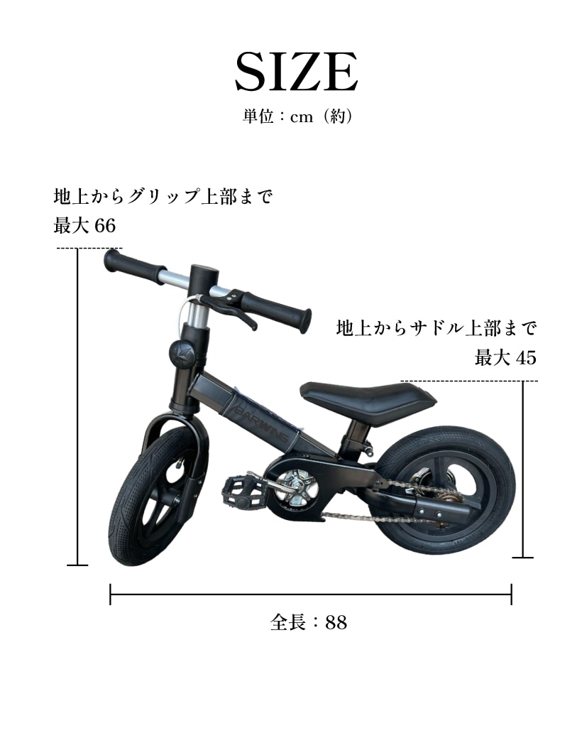 サイズ 全長88cm 地上からグリップ上部まで最大66cm 地上からサドル上部まで最大45cm