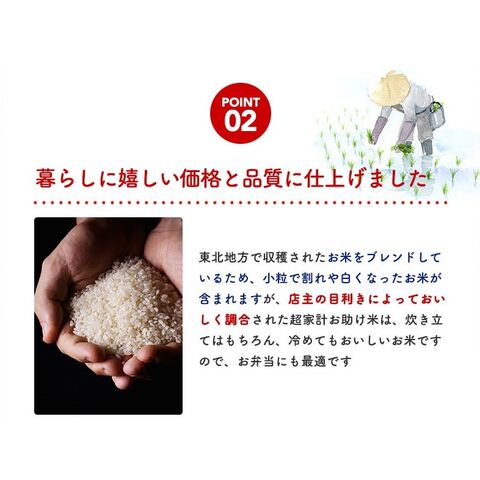 東北地方で収穫されたお米をブレンドしています。お求めやすい価格でご提供できる様、店主の目利きによっておいしく調合された「こまち姫」は、割れや白くなったお米が含まれますが、炊き立てはもちろん冷めても美味しいお米ですので、お弁当にも最適です。