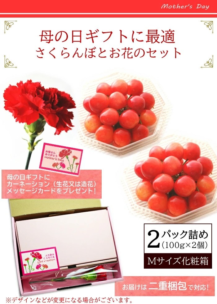 【母の日ギフト5/4-5/9に発送】 母の日 さくらんぼ 山形県産 佐藤錦(秀品 Mサイズ 100g 2個 カーネーション付 ダイヤ型パック入り) / フルーツ 果物 人気 限定商品 産地直送