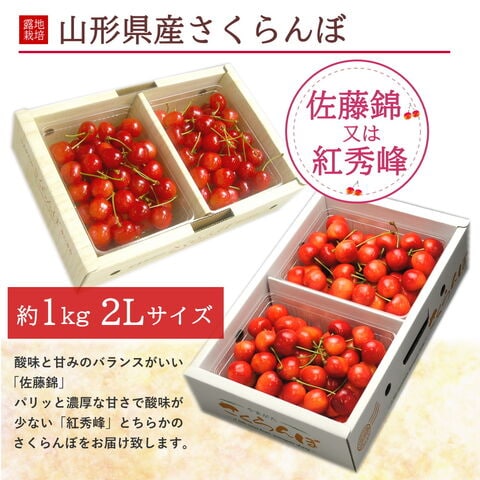 | 名称 | さくらんぼ 佐藤錦 又は 紅秀峰 バラ詰め 2Lサイズ 約1kg |
