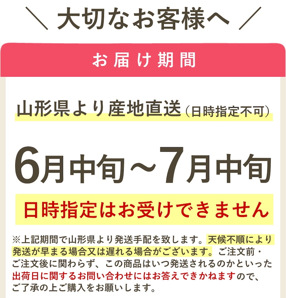| この商品のお届け方法 | 宅配便 商品出荷後の住所変更には≪再送料≫が必要となります。ご注文確定前に今一度お届け先を必ずご確認ください。 【発送予定について】 6月下旬から7月上旬頃にご注文順次お届け対応 ※天候等(大雨、災害、異常気象など)の理由によりお届け時期が変更・キャンセルとなる場合がございます。 ご了承・ご理解のうえでご注文をお願い致します。 【時間帯指定】 お届け時間帯指定をお受けいたします。 【納品書・領収書】 資源節約と業務効率向上の目的から当店からお届けする商品には紙の『納品書・領収書』は同梱しておりません。 ご希望の方は、お手数ですが《注文番号》を添えて当店までご連絡ください。web領収証のURLをご案内させて頂きます。 |