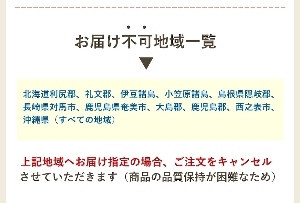 お客様のご都合により商品のお受け取りができない場合、送料・商品代をご負担いただきます。ご了承の上、ご注文ください。 お客様のご都合や長期ご不在による配達センターでの保存によって傷みが発生した場合の返品・交換の対応はできかねます。 |
