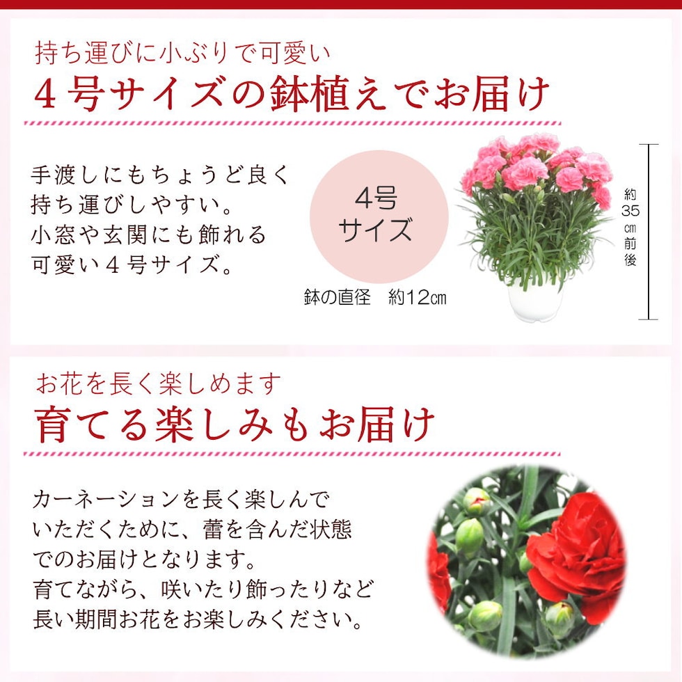 | 商品について | カーネーションはピンク系又はレッド系のどちらかでお届けとなります。 ※お選びすることはできません。 |