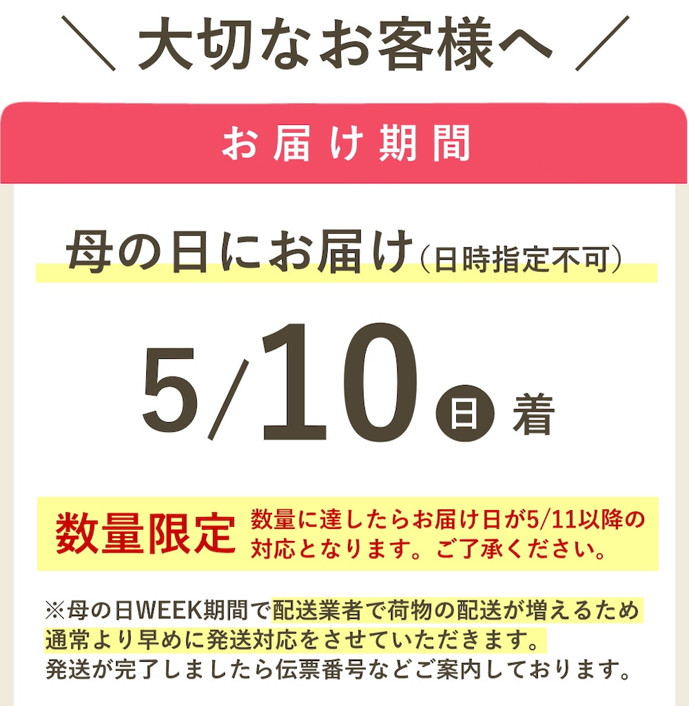 | この商品のお届け方法 | 宅配便 商品出荷後の住所変更には≪再送料≫が必要となります。ご注文確定前に今一度お届け先をご確認ください。 【発送の目安】 母の日ギフト5/10(日)にお届け ※天候等(大雨、災害、異常気象など)の理由によりお届け時期が変更・キャンセルとなる場合がございます。 どうぞご了承・ご理解のうえでご注文をお願い致します。 【時間帯指定】 お届け時間帯指定をお受けいたします。 【納品書・領収書】 資源節約と業務効率向上の目的から当店からお届けする商品には紙の『納品書・領収書』は同梱しておりません。 ご希望の方は、お手数ですが《注文番号》を添えて当店までご連絡ください。web領収証のURLをご案内させて頂きます。 |