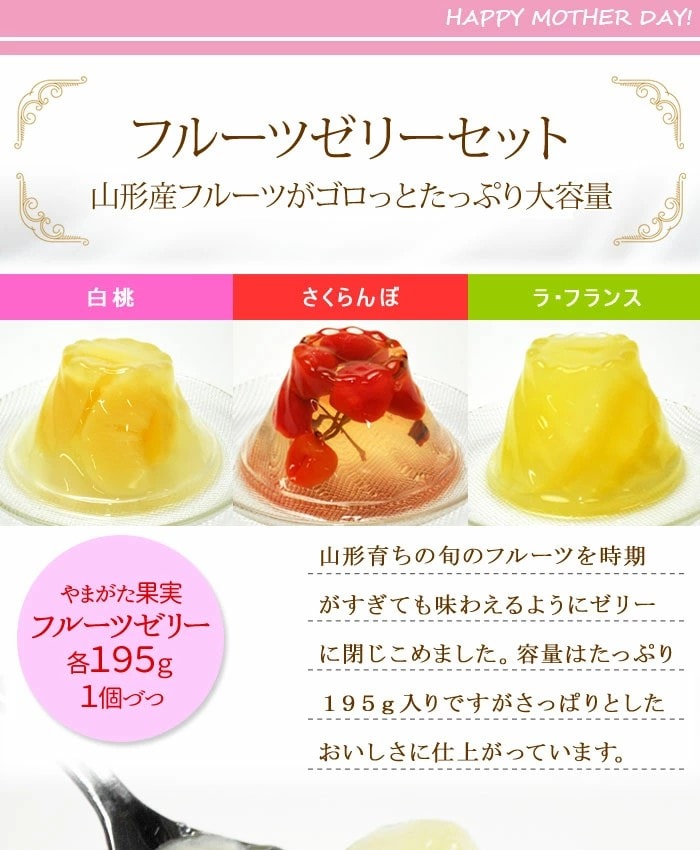 | 原材料名 | さくらんぼ:さくらんぼ、砂糖、洋酒、ゲル化剤(増粘多糖類)酸味料、香料、ラック色素 白桃:白桃、砂糖、洋酒、ゲル化剤(増粘多糖類)、酸味料、香料 ラフランス:ラフランス、砂糖、洋酒、ゲル化剤(増粘多糖類)、酸味料、香料 |