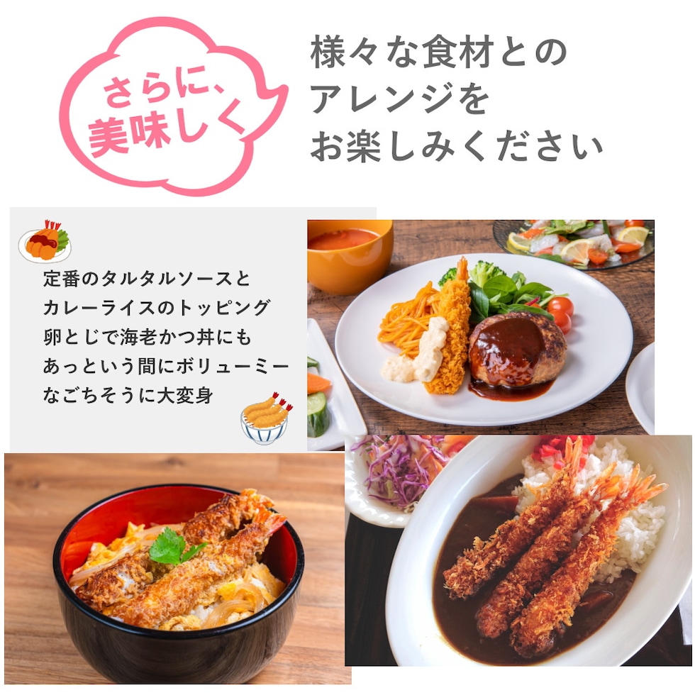 | 原材料名 | 衣(パン粉、小麦粉、脱脂大豆乳、食塩、でん粉、粉末油脂、大豆粉、植物油脂)、バナメイエビ、食塩/加工デンプン、増粘多糖類、pH調整剤、アナトー色素、乳化剤、(一部にえび、小麦、乳成分、大豆含む) |