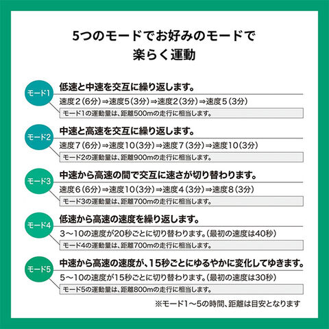運動時間と回転速度を選択して運転できるマニュアルモード、電動アシストを使用せず、ペダルの負荷を利用して運動を行う自力回転モード、本品にプログラムされている5種類の運動を行うプログラムモードの中から、お好きなモードを選択して運動を開始。