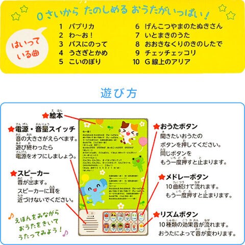 聞きたい歌の「おうたボタン」を押すと曲がスタート。もう一度押すと止まります。お歌によって10種類の効果音が楽しめる「リズムボタン」も押してみてください!「メドレーボタン」は10曲続けて流れます。