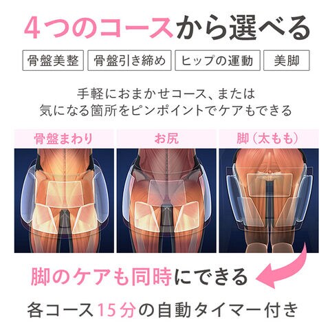 4つのモード(骨盤美整・骨盤引き締め・ヒップアップ・美脚)から選ぶだけで、自動でエアーバッグが加圧→開放を繰り返し、まるで整体サロンのようなケアがご自宅で体感できます。